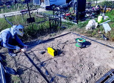 Приступив к работе, мы, первым делом, очистили могилу от травы. Затем положили по периметру места захоронения пятисантиметровую металлическую полосу, которая будет служить границей и дополнительной опорой брусчатке. Получившийся прямоугольник свариваем по углам.