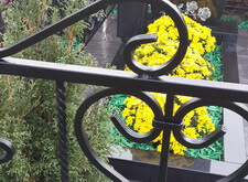 Покрасить ограду, так как чаще всего при установке ограды красят транспортировочной краской, которая приходит в негодность через год. Облицевать бетонный цоколь и бетон обрамляющий цветник. В данном случае для этого мы использовали керамогранит. Установили гранитные лавочку и столик. Посадили две туи и кустовые хризантемы в цветник. Заменили пластиковую вазу на гранитную. Уложили гранитную брусчатку на пол.