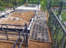 Устанавливаем надгробья. Справа располагается старый гранитный памятник, слева – композиция, изготовленная из полимеров. Скульптуры предоставлены клиентом и были сделаны в другой мастерской, сами они лёгкие, по текстуре и цвету похожи на камень.