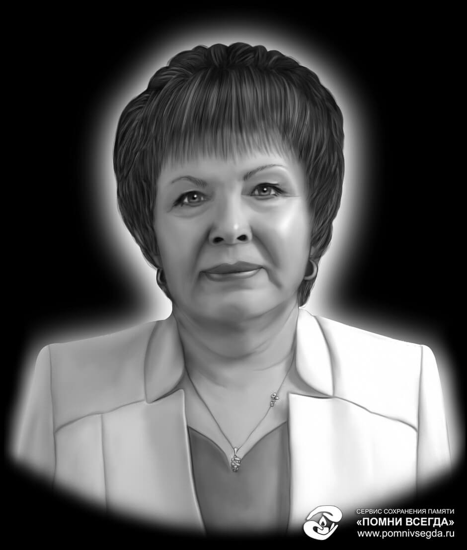 В результате обработки фотографий были произведены следующие действия: тщательнее обрисованы волосы, черты лица усопшей стали резче, что необходимо для более детальной гравировки, убраны некоторые морщины, а также добавлен сияющий ореол вокруг бюста умершей. Именно такой портрет и будет выгравирован на памятнике.