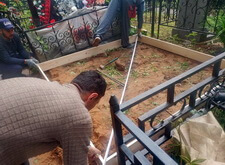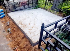Первым делом мы демонтируем памятник, цветник, снимаем оградку, разламываем прилегающую к дорожке бетонную полосу. Затем выставляем опалубку по периметру участка.