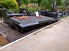 Когда работа с основанием практически завершена, переходим к следующему этапу – укладке гранитной брусчатки по периметру места захоронения. Во это же время покрываем гранитными плитами и залитый бетоном верх каркаса
